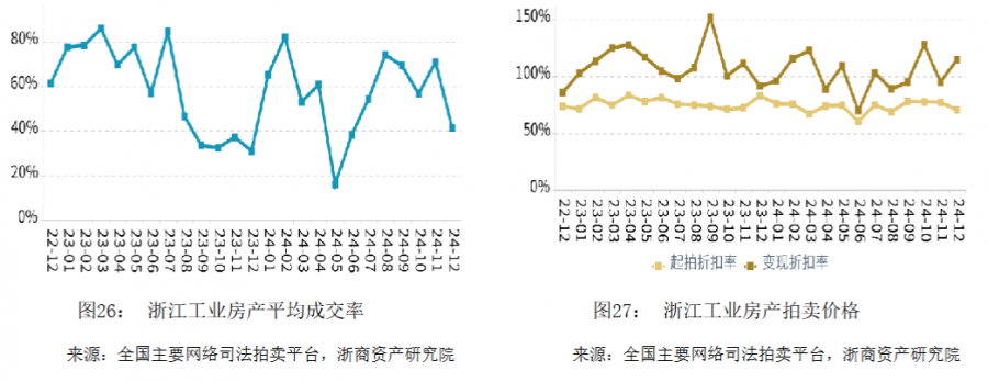 在成交率方面,2024年浙江工業(yè)平均成交率低于同期。寧波市成交率領(lǐng)先,舟山市成交率最低。在拍賣價(jià)格方面,2024年浙江工業(yè)平均變現(xiàn)折扣率低于同期。變現(xiàn)價(jià)相對(duì)于起拍價(jià)的溢價(jià)幅度相比于同期有所收窄。